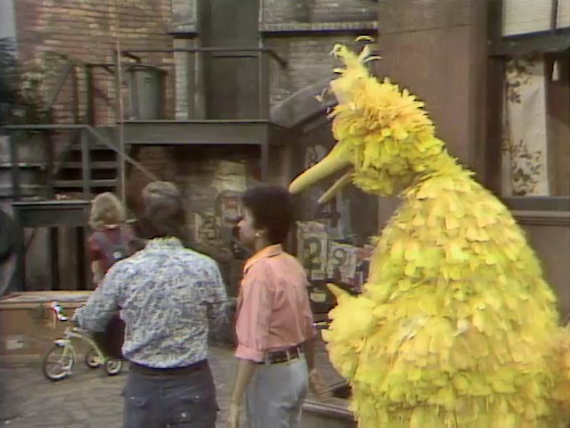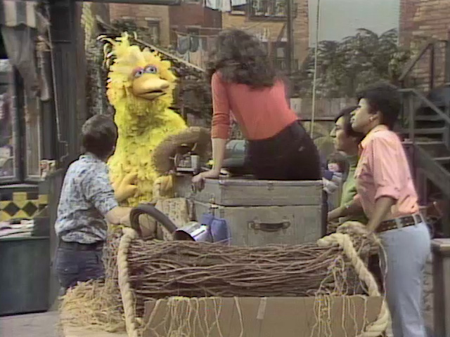 The adults encounter Big Bird as he runs away, dragging his nest and the rest of his belongings. He repeats to them what he heard them saying, and they all correct him: Susan and Bob were talking about Gordon, whom Susan says can’t dance; Luis was complaining about the feathers that fell out of a pillow he was trying to fix; and Maria was talking about an abandoned bird’s nest in the awning above Hooper’s. Big Bird is relieved, and Bob and Susan help move his things back home. |