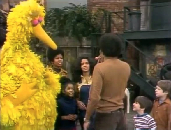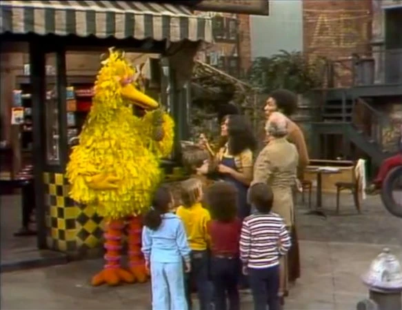 SCENE 5 | Big Bird skates along the block to an organ arrangement of the "Sesame Street Theme." He thanks an imaginary crowd before backing into his home area, ending in a crash. Maria announces the sponsors. |
