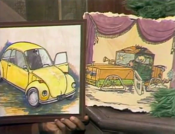 SCENE 2 | Gordon shows Paul, Spencer, and Ruth the drawing one of his students made of his Volkswagen Beetle. Oscar doesn't care for it much, preferring his Grouchmobile. He produces a drawing of it, and Gordon and the kids point out the differences between the two cars: namely, Oscar's car has broken windows, tin cans for headlights, and flat tires. Gordon declares it the junkiest car he's ever seen, which Oscar takes as a compliment. "I never go anywhere in it. You know, when you play all your silly, dopey games here, it's so stupid and boring around here, who'd want to leave? I love it!" says Oscar. |
