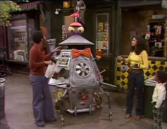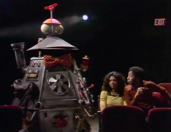 SCENE 4 | Sam the Robot plays an internal game of pinball (indicated by the noises he makes and his "TILT" sign). He encounters Maria and David on their way to the movies, and asks to join them since he's never been to one. They agree to take him as long as he promises not to flash any lights or make any noise. Sam agrees, though he makes a lot of chatter on the way there. |