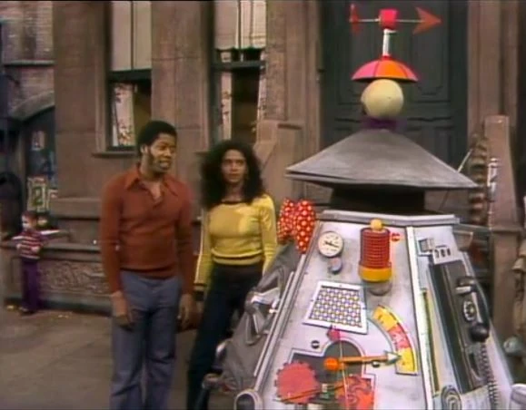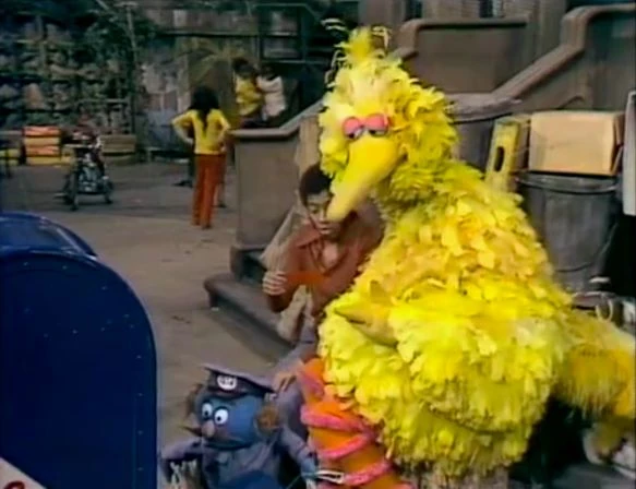 SCENE 2 | An Anything Muppet mailman (Jerry Nelson) collects the mail, finding a dollar bill. He and Big Bird wonder how it got in there, and Big Bird provides several possible scenarios including someone with too much money or a chase involving big and little monsters. David comes along and asks Big Bird why he gave him a letter that’s addressed to Maria’s mother; again Big Bird struggles to come up with an answer. Maria passes through and casually switches the items as Big Bird gives an embarrassed laugh. |
