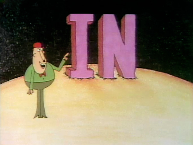 Cartoon | Two boys notice a D, saying it looks fat. A resonant voice (Gary Owens) informs them that it's the letter D. This leads to a jazzy story about a dog who digs for dice, wins a duck, and buys a dinosaur with a dime. Moral: "If you dig a dinosaur, drop your duck for a dime." (First: Episode 0016) |