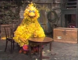 Big Bird finishes cleaning the area and beckons for Mr. Hooper, Bob, and Maria to have lunch outside at the table. To his horror, Mr. Hooper discovers that the table's legs are now only three inches long! Big Bird walks off in a huff after Mr. Hooper yells at him, and Bob and Maria try to console the seething storekeeper. |