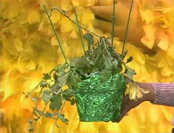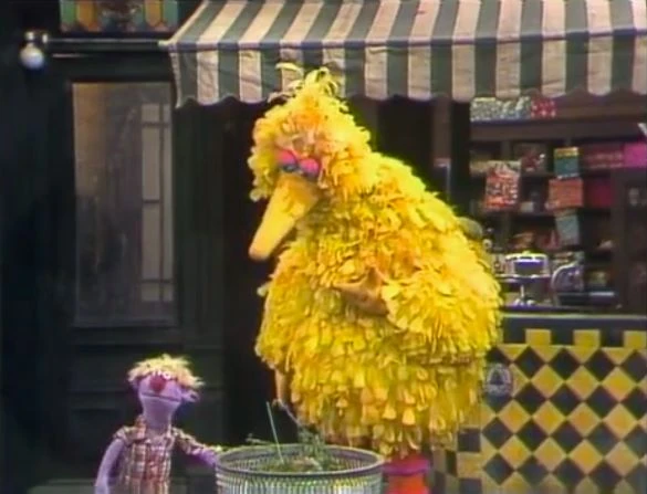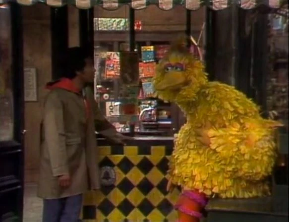 SCENE 4 | Big Bird sits under the awning of Hooper's Store, feeling miffed that he can't play because itβs raining today. Gordon tells him that rain supplies the lakes with water, and to imagine a world without it. In Big Birdβs fantasy, David throws out his dead. dried-up houseplant. Maria tosses out an empty fishbowl, telling Big Bird how there wouldn't be any fish witout water. Big Bird's friend Dick (Richard Hunt) appears all dirty and disheveled, unable to clean his body or his clothes without water. All this talk makes Big Bird thirsty, but not even Hooper's Store has water. Back in reality, David notices that the rain has stopped, and Big Bird begs the clouds not to go away. |
