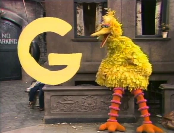 SCENE 1 | Big Bird finds the letter G on the basement railing of 123 Sesame Street. He tries to think of a G word as the letter says, "Grow," over and over again, increasing in size. Big Bird shushes the letter, which bids him goodbye. |