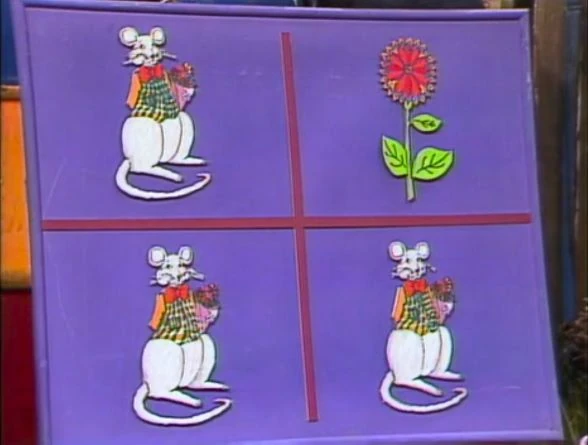 SCENE 3 | At Big Bird's nest, Maria plays βOne of These Thingsβ with the kids using pictures of three mice and a flower. |