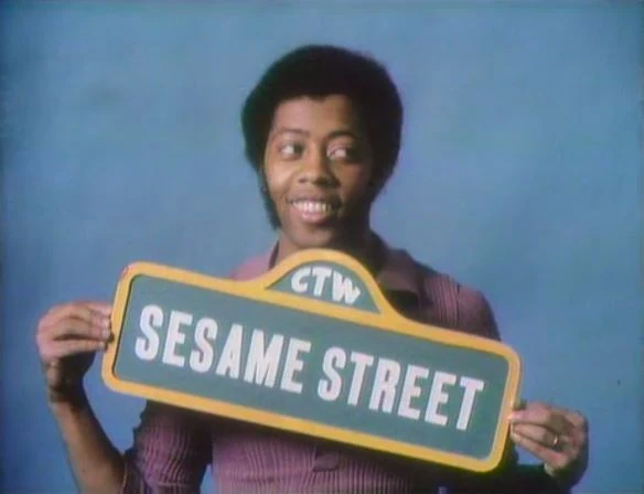 CLOSING SIGNS | David holds the Sesame Street sign, and Maria holds the Children's Television Workshop sign. |