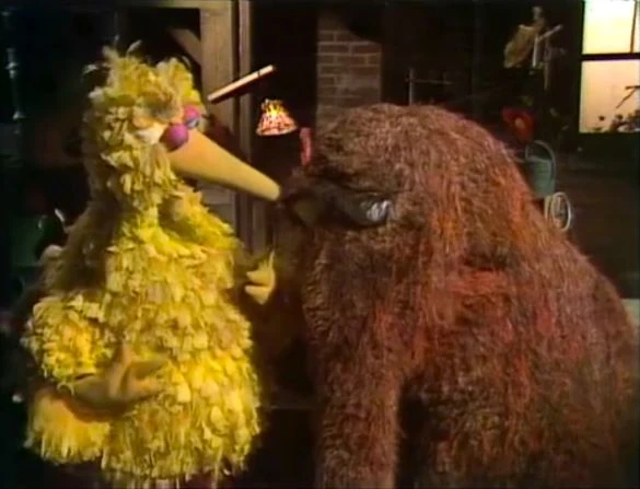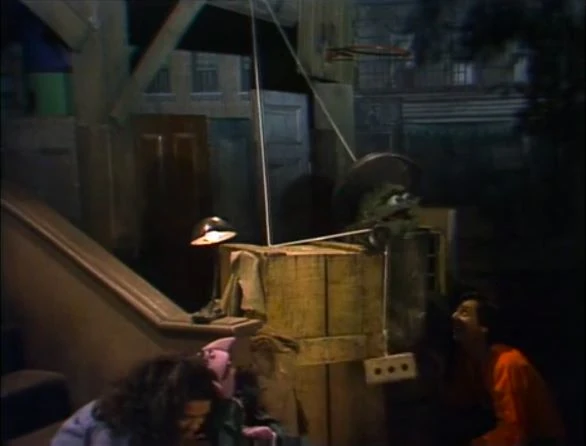 SCENE 2 | The adults discuss the blackout while hanging out on the stoop. Big Bird comes by and tells them he wasn't afraid, as he had Mr. Snuffleupagus for company. He goes to his nest to fetch him and prove he's real, though Snuffy is feeling a bit nervous about it. Just as Snuffy exits through the construction doors, another blackout occurs and the street goes dark. Big Bird heads back to his nest and the adults start to disperse, bumping into Snuffy and speaking to him without even realizing who it is. As Snuffy goes back to his cave, the camera begins to zoom toward Ernie and Bert's apartment... |