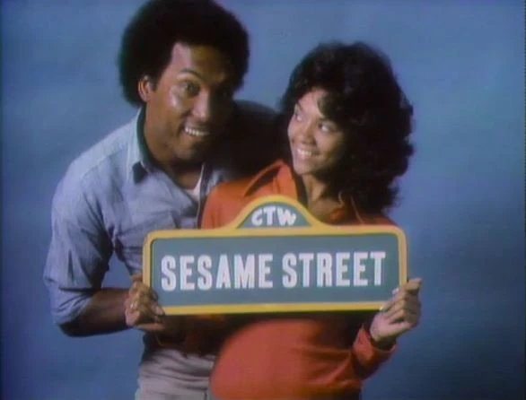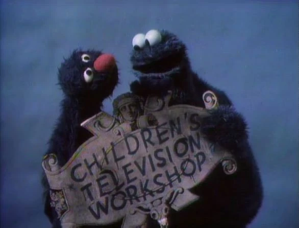 CLOSING SIGNS | Gordon and Maria hold the Sesame Street sign, and Grover and Cookie Monster hold the Children's Television Workshop sign. |