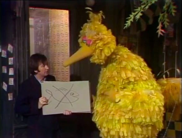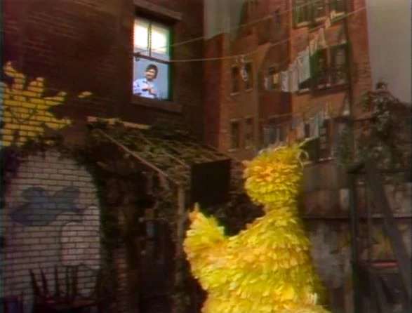 SCENE 1 | Early in the morning, Luis has to make some deliveries and asks Big Bird to pass along a message to Bob that he can’t go fishing with him today. Big Bird tries calling for Bob at his apartment window, but Bob can’t open the stuck window and can't hear what he's saying. Big Bird decides to say it with pictures, and draws one picture of a fish crossed out with an X, and another of someone sleeping in bed. Bob still doesn't understand, so he comes downstairs outside and finally gets the message from Big Bird: that he might as well sleep in today. |