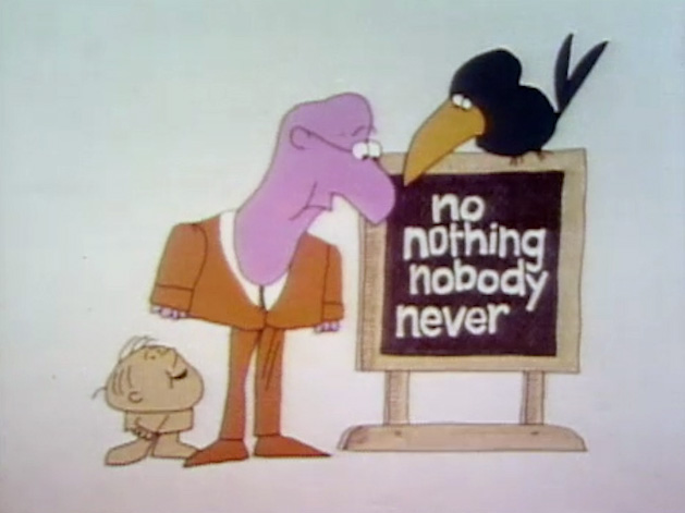 Cartoon | Eugene wants his talking crow Willis to name some N words, and Willis replies with "no," "nothing," "nobody" and "never." (First: Episode 0101) |