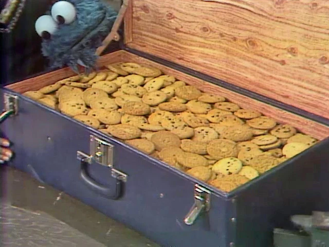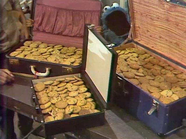SCENE 3 | Cookie Monster returns with a trunk and says he's all ready for a happy vacation. Luis asks him if he packed a toothbrush, but Cookie says he doesn't need one: he hasn't got any teeth. Maria asks to see what he's packed, so Cookie opens the trunk to reveal that it's filled to the brim with cookies. Luis explains that the whole idea was to plan for what he needed to bring on his vacation, but Cookie insists this is all he needs for a wonderful day on the beach. Maria asks what he's going to do if he decided to play tennis and finds that he hadn't planned to bring the proper equipment with him. Cookie recognizes that they've made a good point, and leaves again. |
