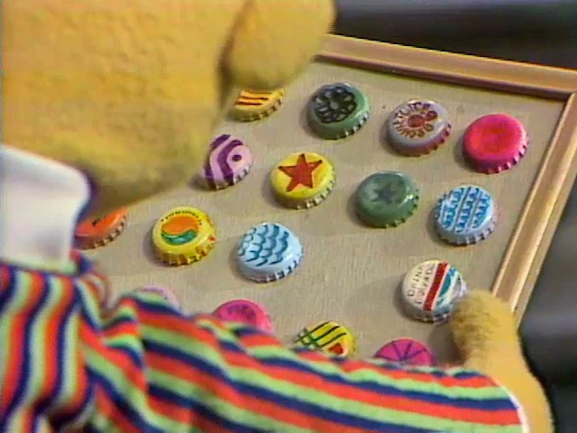 Bert believes all hope to be lost and begins chastising David for making light of his plight when Big Bird stops by. He'd like to join the scully game and says he'll have a bottlecap to contribute as soon as he opens the soda pop he just purchased at Hooper's Store. Bert's attention is sprung when he hears it's a Watermelon Whip, but his excitement diminishes when he learns that Mr. Hooper got six cases of it in β that's 144 bottles, Big Bird calculates β and dismisses the once-rare flavor as worthless now. To replace the open spot on his cork board, he's now got to go find a Blueberry Bubbler... and he doesn't even like that one. |