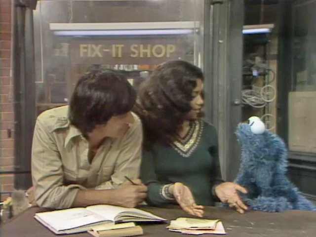 SCENE 2 | Cookie Monster approaches Maria and Luis doing some bookkeeping in front of the Fix-It Shop and informs them he's going on vacation. They note that he doesn't have any luggages though; what if he needs something for when he goes to the beach? Cookie realizes his lack of preparedness, and leaves to remedy the situation. |