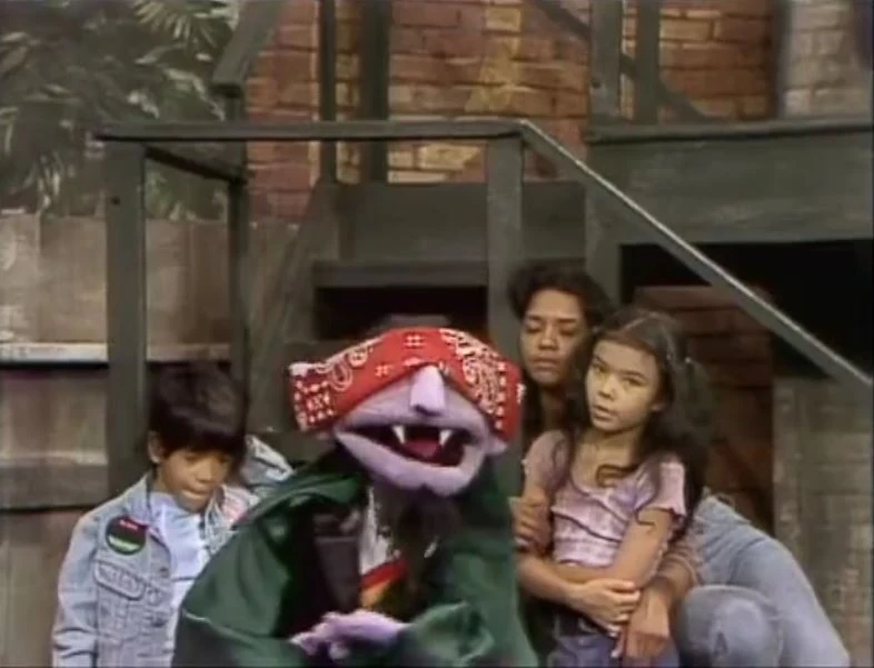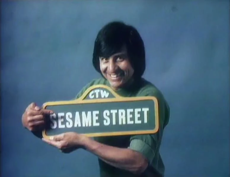 | CLOSING SIGNS | Luis holds the Sesame Street sign, while Maria and David hold the Children's Television Workshop sign. |