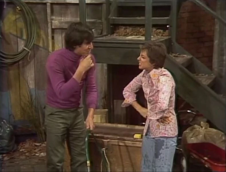 Luis and Linda proceed to fill up a washtub in the yard with a hose. Linda waits for Luis to turn the water on, but when he does no water comes out. When Linda looks into the hose, she goes from being dry to being wet. | |