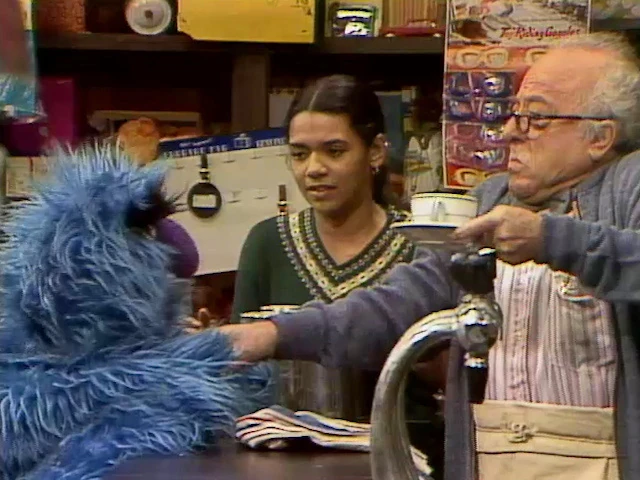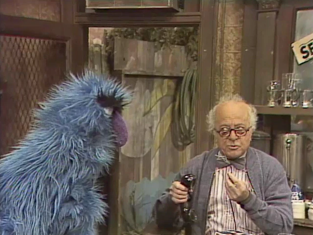 SCENE 1 | Herry Monster enters Hooper's Store and knocks over a stack of cans. As he apologizes, he smashes a tower of drinking glasses. To make up for it, he answers the phone, pulling the cord out of the wall. Mr. Hooper kicks him out; Herry knocks over another tower of cans as he leaves. |