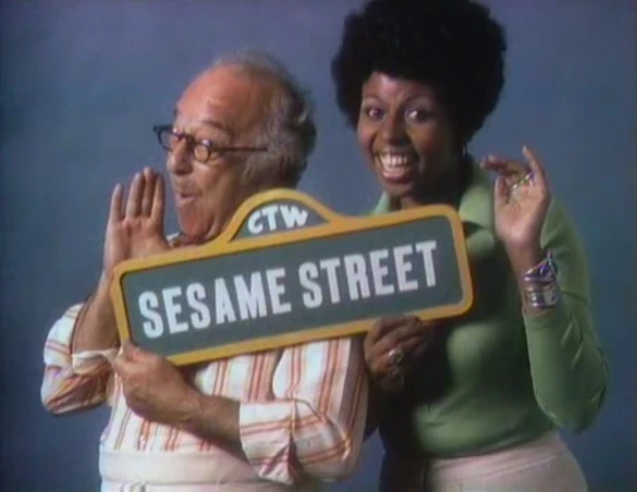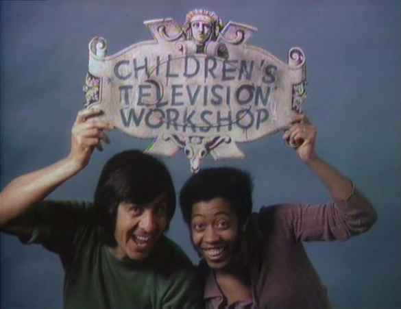 CLOSING SIGNS | Mr. Hooper and Susan hold the Sesame Street sign, and Luis and David hold the Children's Television Workshop sign. |