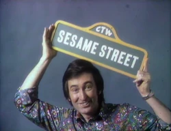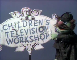 CLOSING SIGNS | Bob holds the Sesame Street sign, and Sherlock Hemlock holds the Children's Television Workshop sign. |