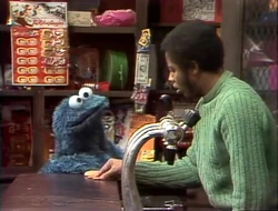 SCENE 3 | Cookie Monster comes to Hooper's and orders the smallest cookie that they have in stock, to David's surprise. Cookie explains that the smaller the cookie, the quicker it is to eat and reach his tummy. Once he eats it, he realizes his tummy is in no hurry after all and eats the remaining cookies as well. |