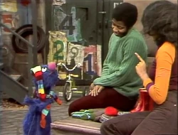 SCENE 2 | Grover sets out his new winter-wear outside 123 Sesame Street. David and Maria believe something doesn't belong and they sing "Three of These Things" to help him understand. They point out he has small items - mittens, boots, and earmuffs, but two large socks won't possibly fit him. Grover shows that he uses one for a stocking cap and the other for a scarf. |