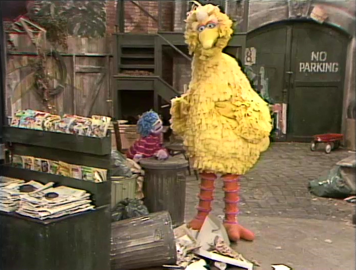 SCENE 1 | Big Bird finds Bad Barney up to no good again, seeing he's just tipped over a garbage can. Barney prods the bird, thinking he's never done anything bad before. Big Bird counters that he's been bad before and reluctantly agrees to prove he's not just a goody-two-shoes. |