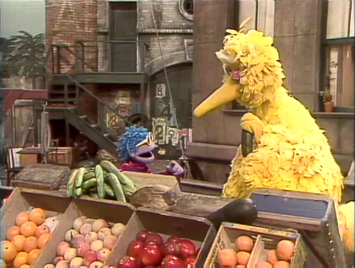 SCENE 1 cont'd | The two find Mr. Macintosh's produce cart has been left unattended and Barney wants Big Bird to steal something. Big Bird isn't sure, but constantly being referred to as "a chicken" provokes him into taking a sole zucchini. Barney is impressed, while Big Bird retreats to his nest to hide the stolen property. Barney threatens to rat Big Bird out unless he does a few favors for him (such as cooking the zucchini, getting a backrub, doing his homework...). |