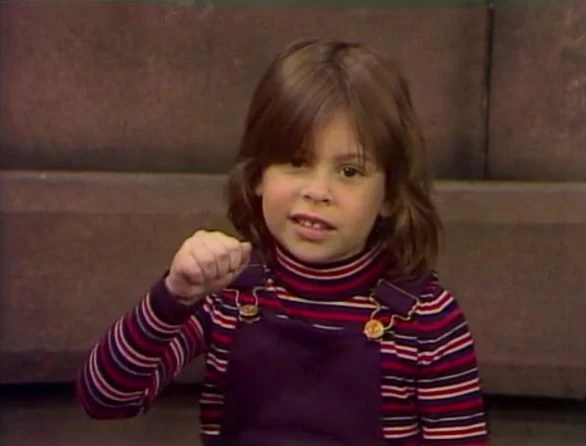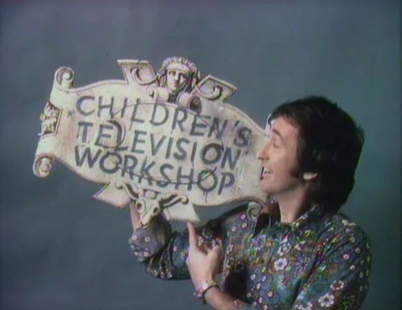 CLOSING SIGNS | David holds the Sesame Street sign, and Bob holds the Children's Television Workshop sign. |