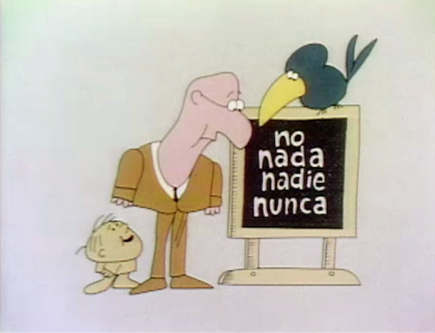 Cartoon | Eugene wants his talking crow Willis to name some N words, and Willis replies with "no," "nothing," "nobody" and "never." (Spanish version) (First: Episode 0358) |