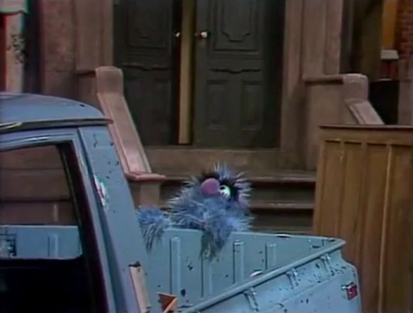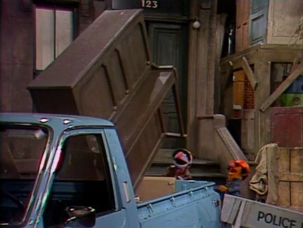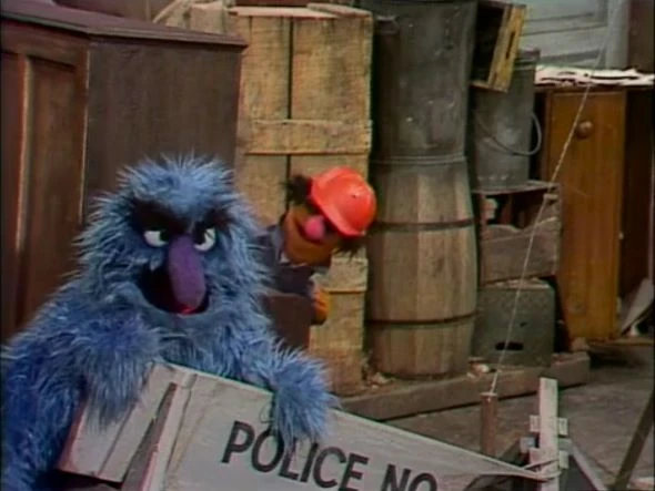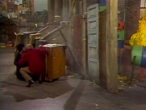 SCENE 4 | Susan and Gordon hear a vacuum cleaner being used by Big Bird behind the construction doors. Big Bird tells him that it's not a vacuum; it's his friend Mr. Snuffleupagus, who is busy cleaning the feathers out of his nest. The others are skeptical, believing that the sound they hear is from a real vacuum cleaner and not his "imaginary" friend. Meanwhile, Snuffy has finished vacuuming but the feathers stuffed in his snuffle cause him to sneeze, blowing dust and feathers all over the place, knocking one of the construction doors down, and has Susan and Gordon ducking for cover. The couple rushes over to Big Bird wanting to know what caused the blast, but given what they said before he refuses to let them in, instead comforting the recovering Snuffleupagus. |