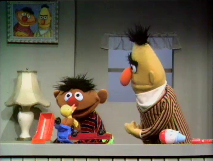 Muppets | Ernie and Bert: Putting the Basketball Away β Ernie comes up with a way for him to remember to put his basketball away before he goes to sleep. (First: Episode 0134) |