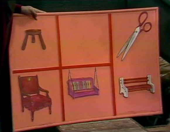 SCENE 3 | Gordon and Susan play a βHere Are Some Thingsβ game with the kids using pictures of a stool, a chair, a porch swing, a pair of scissors, and a bench. |