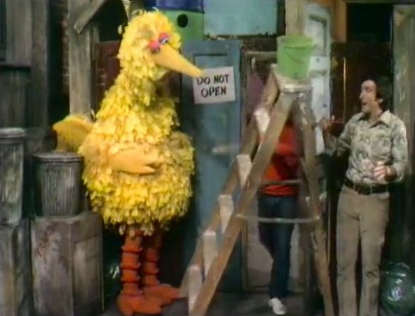 SCENE 3 | Big Bird is putting some new nails into the construction doors that lead to the playground and his nest, and he's about to use the ladder that's currently holding a bucket of nails. Bob warns him about foot traffic as a possible hazard, but Big Bird has planned for this with a "DO NOT OPEN" sign, and puts it on the outside of the doors. Bob tries to tell him about those on the other side of the wall who can't see the sign when Luis exits through the door, accidentally knocking over both the ladder and the nails. |