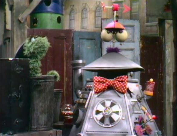 SCENE 2 | Sam the Robot gives a lesson on up and down by moving his eyes in different directions. Oscar tells him to go away, which Sam interprets as an invitation to help him. He begins to say when Oscar is up and down from his can, infuriating Oscar so much that he decides to throw something at him (inadvertently helping Sam when he starts malfunctioning). |
