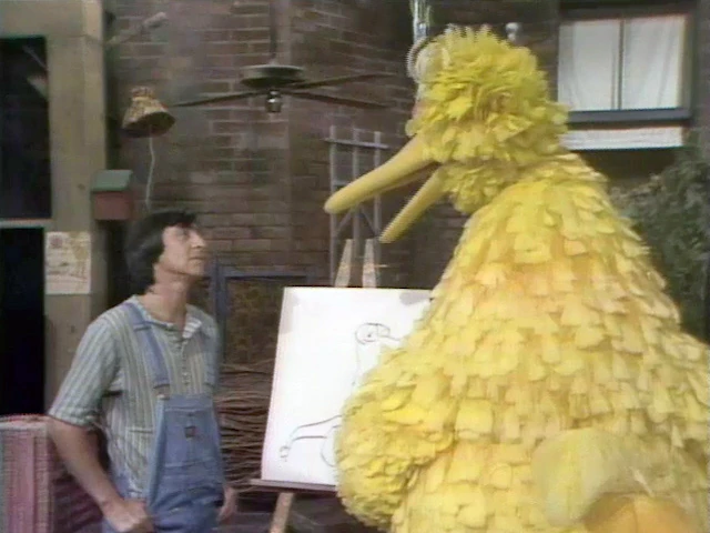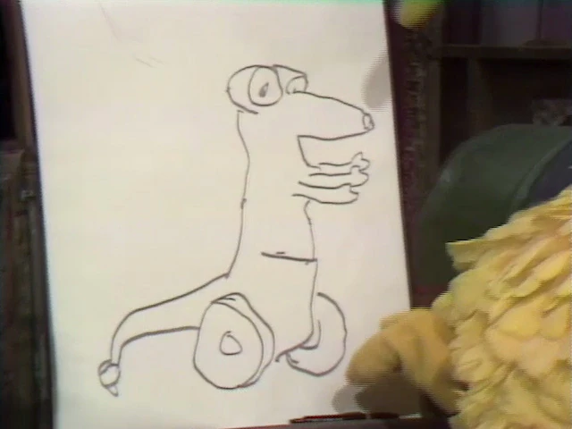 SCENE 1 | Mr. Snuffleupagus asks Big Bird to draw a friend of his on an easel. Snuffy describes his friend as having two wheels instead of legs, a pouch in front, three arms, two headlights for eyes, and a tail with a little wheel on it. Big Bird finds such a creature scary until Snuffy explains that his friend, the Wheelermonster, is a nice creature who likes pizza. Snuffy claims that the Wheelermonster is real and leaves to go look for him. When Luis comes by, he assumes that the drawing is another one of Big Bird's imaginary friends, but Big Bird sets him straight: Big Bird believes that the Wheelermonster is Snuffy's imaginary friend. |