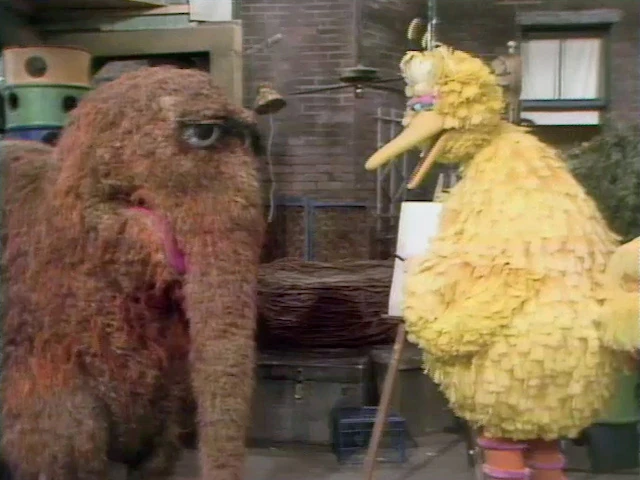 SCENE 2 | Percy wants Big Bird to guess how he got up to eye level with him. After a few tries, the camera pans out to reveal that Percy is sitting on Snuffy's back. |