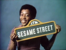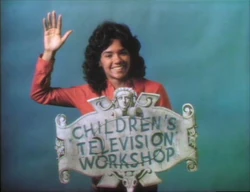 CLOSING SIGNS | David holds the Sesame Street sign, and Maria holds the Children's Television Workshop sign. |