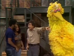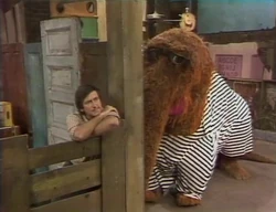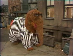 SCENE 3 | Bob settles in for a nap on the carriage house steps. Down the block, Mr. Snuffleupagus wants to show Big Bird the new striped overalls that his mother made for him. A bleary-eyed Bob sees Snuffy going by, and calls to tell everybody. In a reversal of roles, Big Bird hears Bob's description and gets more and more excited, but decides that he couldn't have seen a Snuffleupagus -- Snuffy doesn't have black and white stripes. |