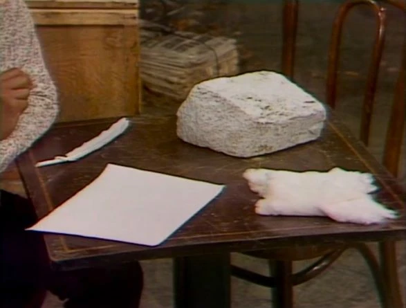 SCENE 3 | Maria plays a "Three of These Things" game using a rock, a wad of cotton, a sheet of paper, and a white feather. After showing that the rock is heavy and the other things are light, she lugs the big rock over to Oscar's can and drops it in for Oscar to admire. |