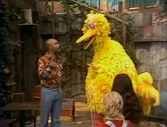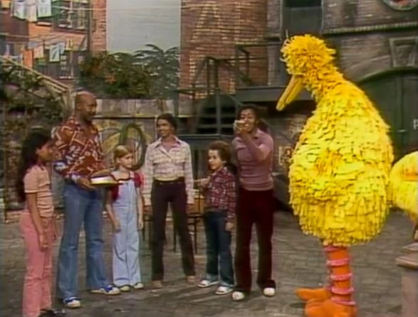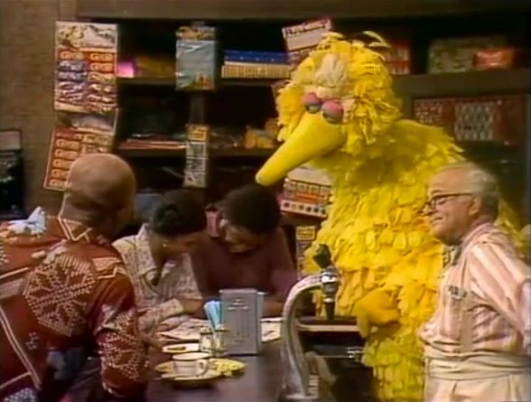 SCENE 5 | Big Bird stops by Hooper's Store and asks if he can come with David and Maria to the movies, but they say the late movie he wants to see will be past his bedtime. He then asks Mr. Hooper for a birdseed cupcake, but Mr. Hooper doesn't want to give him one before his dinner (since he’s only a kid). Gordon, on the other hand, is having an early dinner because he’s taking his car to the shop to get fixed. Big Bird wants to drive along, but he can’t come along since he’s not old enough to drive. Big Bird leaves and goes to play jumprope with some kids instead, but all of the grown-ups are too busy to join in his game. Seeing how none of the grown-ups have the time to play, Big Bird is happy that he's a kid. |