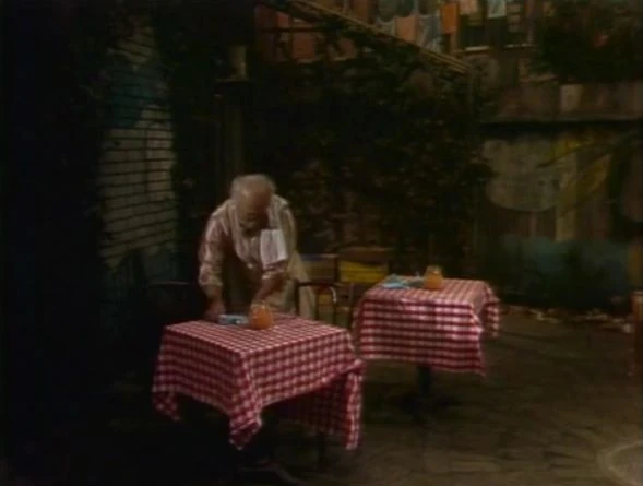SCENE 6 | Mr. Hooper sets the outdoor tables for some nighttime customers as Maria announces the sponsors. |