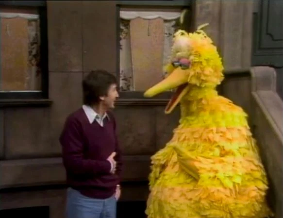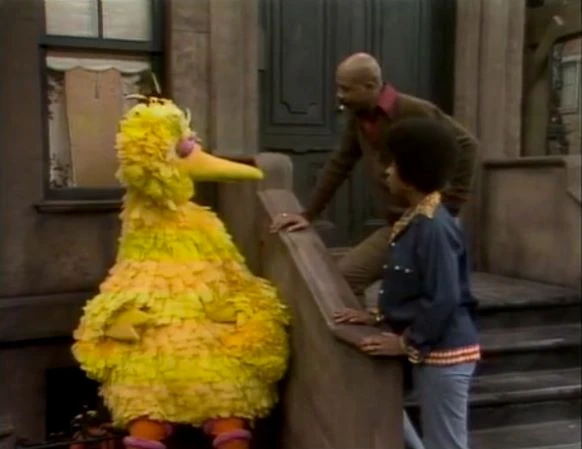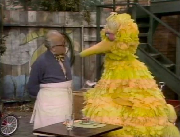 SCENE 5 | Mr. Hooper serves some food to Big Bird, whoβs bored just being by himself. Mr. Hooper tells him to use his mind to observe the world around him and figure things out: "As long as you have a mind, you don't have to be bored," he explains. Big Bird does so and sees Bob reading a letter from his brother in San Diego, Rafael and Debbie reading a comic book together, and Susan and Gordon talking, all the while speculating on what theyβre experiencing. When Mr. Hooper joins him after finishing his work, Big Bird tells him to keep it down or he'll miss all the excitement. |