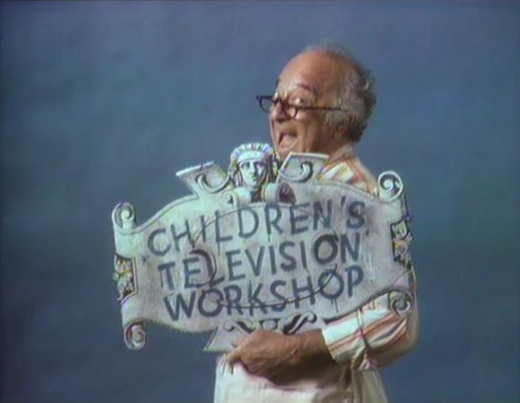 CLOSING SIGNS | Susan holds the Sesame Street sign, and Mr. Hooper holds the Children's Television Workshop sign. |