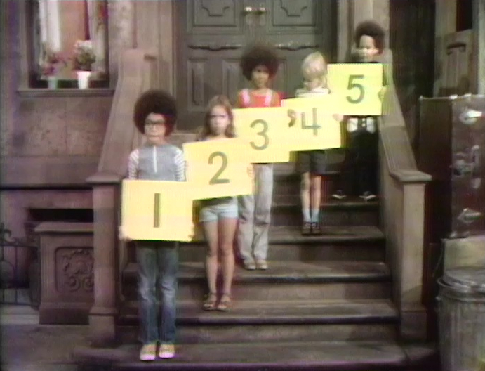 Insert | Five signs are counted forward and backward as they appear on the stoop, followed by five kids holding the signs. (First: Episode 0417) |