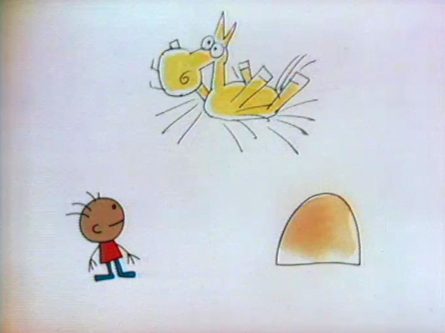 Cartoon | Two boys notice a D, saying it looks fat. A resonant voice (Gary Owens) informs them that it's the letter D. This leads to a jazzy story about a dog who digs for dice, wins a duck, and buys a dinosaur with a dime. Moral: "If you dig a dinosaur, drop your duck for a dime." (First: Episode 0016) |