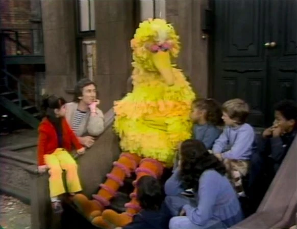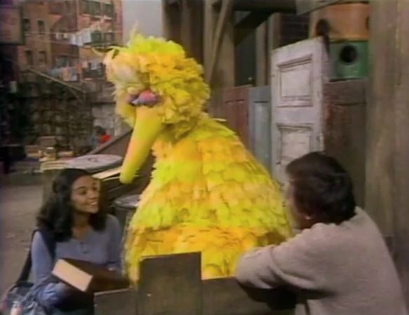 SCENE 5 | Big Bird is discouraged about how his name just says what he is, and isn't as unique as Bob's or other people's names. Bob thinks that "Big Bird" is a great name, and they decide to pretend for a while that they've traded names. Maria is at first confused when greeting them, then gives βBobβ an old book belonging to "him," though the book is too big and complex for Big Bird to read. A mailman (Richard Hunt) arrives with a package for βBig Bird,β so Bob ends up with a package of birdseed cookies from Granny Birdwhistle. They both agree to keep their own names, and trade their gifts. |