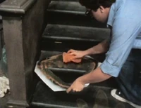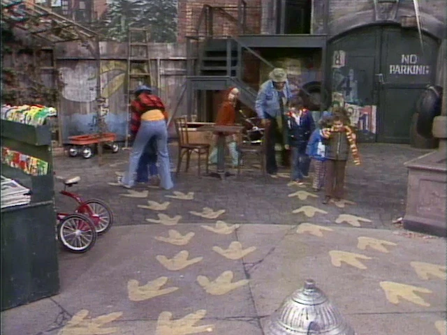 SCENE 2 | David has found an anonymous note inviting him and everybody to play a game called "Follow in My Footsteps." David and Maria lead the kids down the trail of familiar-looking three-toed footprints found outside Hooper's Store and around Sesame Street. The big surprise at the end of the trail is nothing more than a hug and a kiss from Big Bird for everybody. |