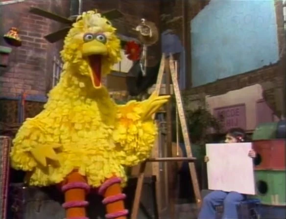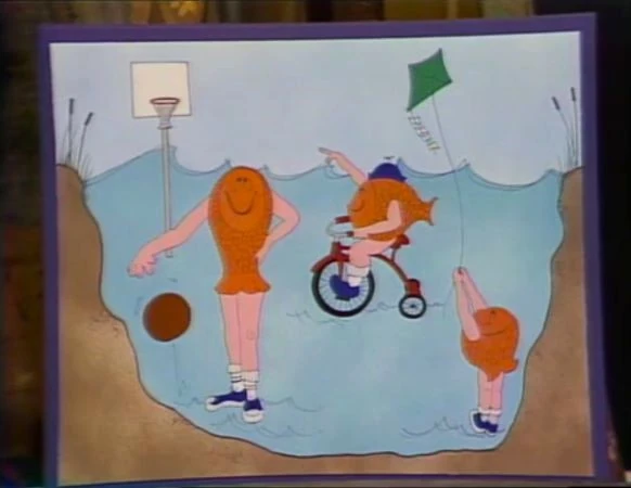 SCENE 4 | Big Bird recites a silly poem about how fish live in the water, with the assistance of Alissa who display drawings of fish doing human things (like having arms and legs, holding umbrellas, and wearing clothes). |