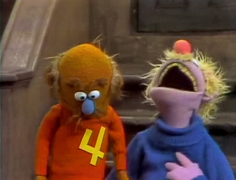 Muppets | Harvey Kneeslapper tells a man that "stickys" are really useful. The man asks, "What's a sticky for?" Then Harvey slaps a number 4 on the man's chest and says, "This is sticky, and it's a four!" (First: Episode 0668) |