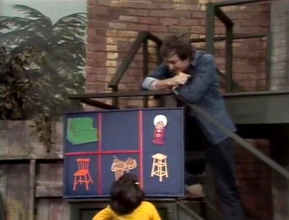 SCENE 4 | Bob plays a "Here Are Some Things" game with a kid using drawings of things one sits on and a gumball machine. The kid has a little trouble comprehending the game, but Bob helps her understand. |